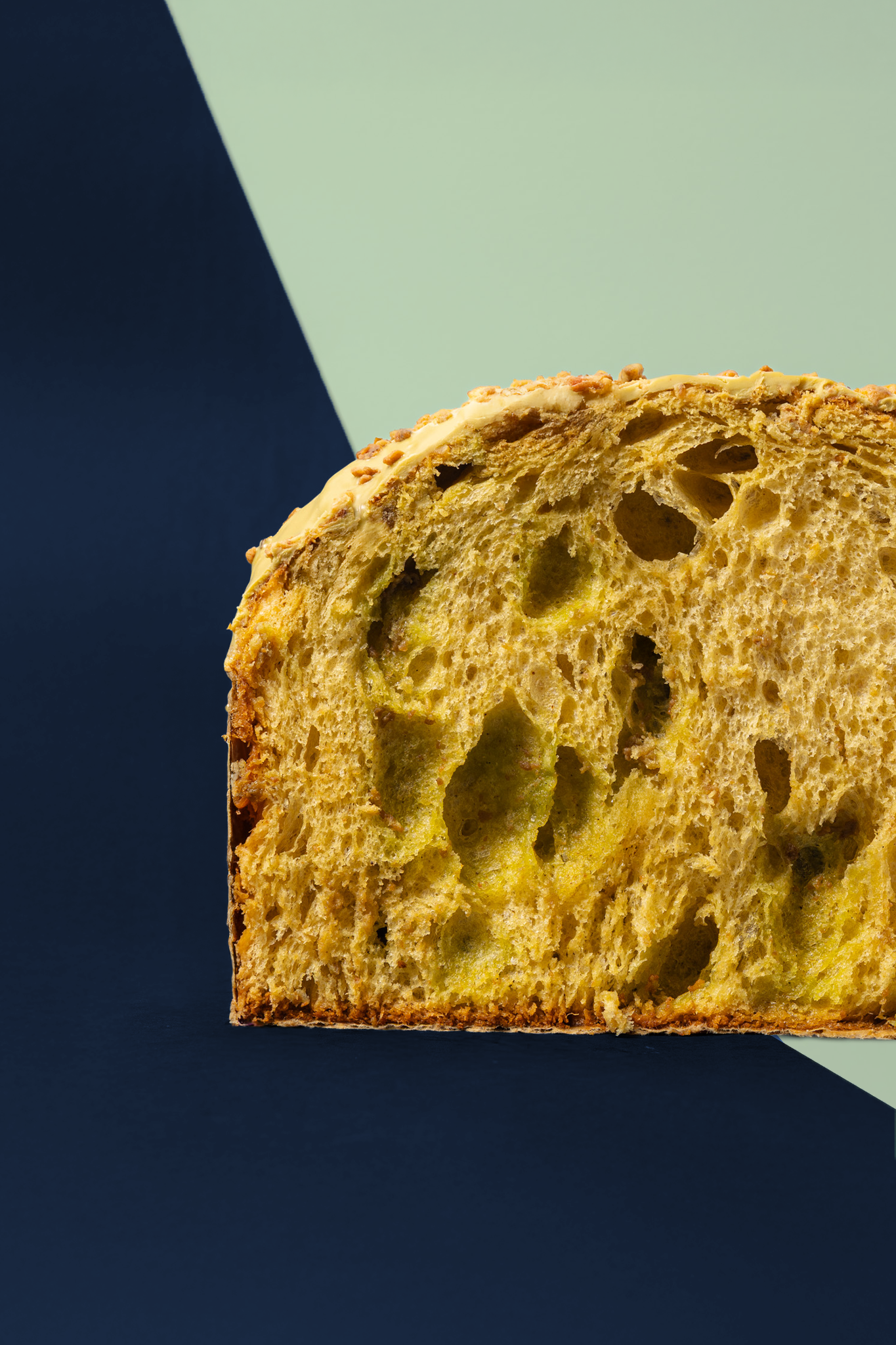 Impasto: FARINA 00*, acqua, BURRO*, TUORLO D’UOVO*, MALTO D’ORZO*, PASTA DI PISTACCHIO, miele, vaniglia, lievito madre, zucchero.